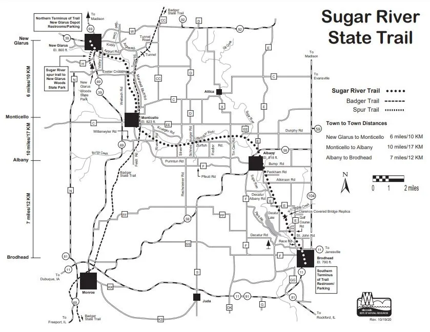 The Sugar River Trail is a picturesque and versatile trail, ideal for both hiking and biking, offering stunning views of Green County's natural beauty. The trail follows an abandoned railroad line, crosses the highway into fields and forests, and crisscrosses over several rivers, providing a delightful outdoor experience.